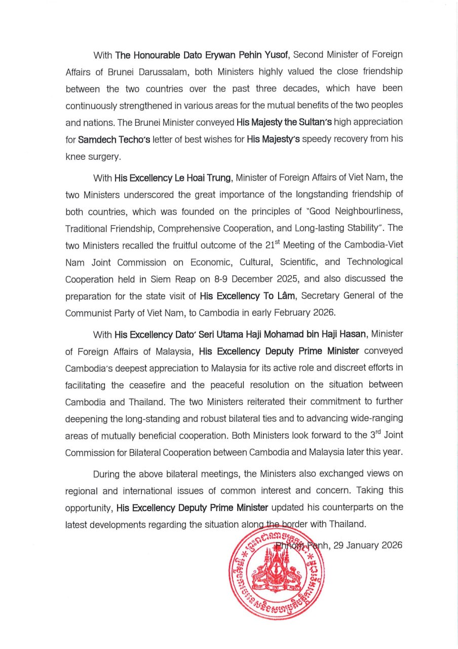 ក្នុងឱកាស នៃការចូលរួមកិច្ចពិគ្រោះយោបល់ក្រៅផ្លូវការក្នុងទម្រង់ពង្រីក ឧបនាយករដ្ឋមន្ត្រី បានជួបទ្វេភាគីជាមួយរដ្ឋមន្ត្រីការបរទេសនៃបណ្តាប្រទេសសមាជិកអាស៊ាន ដើម្បីពិភាក្សាអំពីបញ្ហាដែលជាផលប្រយោជន៍ និងក្តីកង្វល់រួម ជាមួយ លោក ដាតូ ស៊ីរីវ៉ាន់ ពើហ៊ុន យូស៊ូហ៍ រដ្ឋមន្ត្រីការបរទេសទី២ នៃព្រុយណេដារ៉ូស្សាឡាម។ រដ្ឋមន្ត្រីទាំងពីរបានវាយតម្លៃខ្ពស់ចំពោះទំនាក់ទំនងមិត្តភាពដ៏ជិតស្និទ្ធរវាងប្រទេសទាំងពីរក្នុងពេលបីទសវត្សរ៍កន្លងមកនេះ ដែលត្រូវបានពង្រឹងជាបន្តបន្ទាប់នៅលើវិស័យជាច្រើន ដើម្បីផលប្រយោជន៍ ទៅវិញទៅមករបស់ប្រជាជន និងប្រជាជាតិទាំងពីរ។