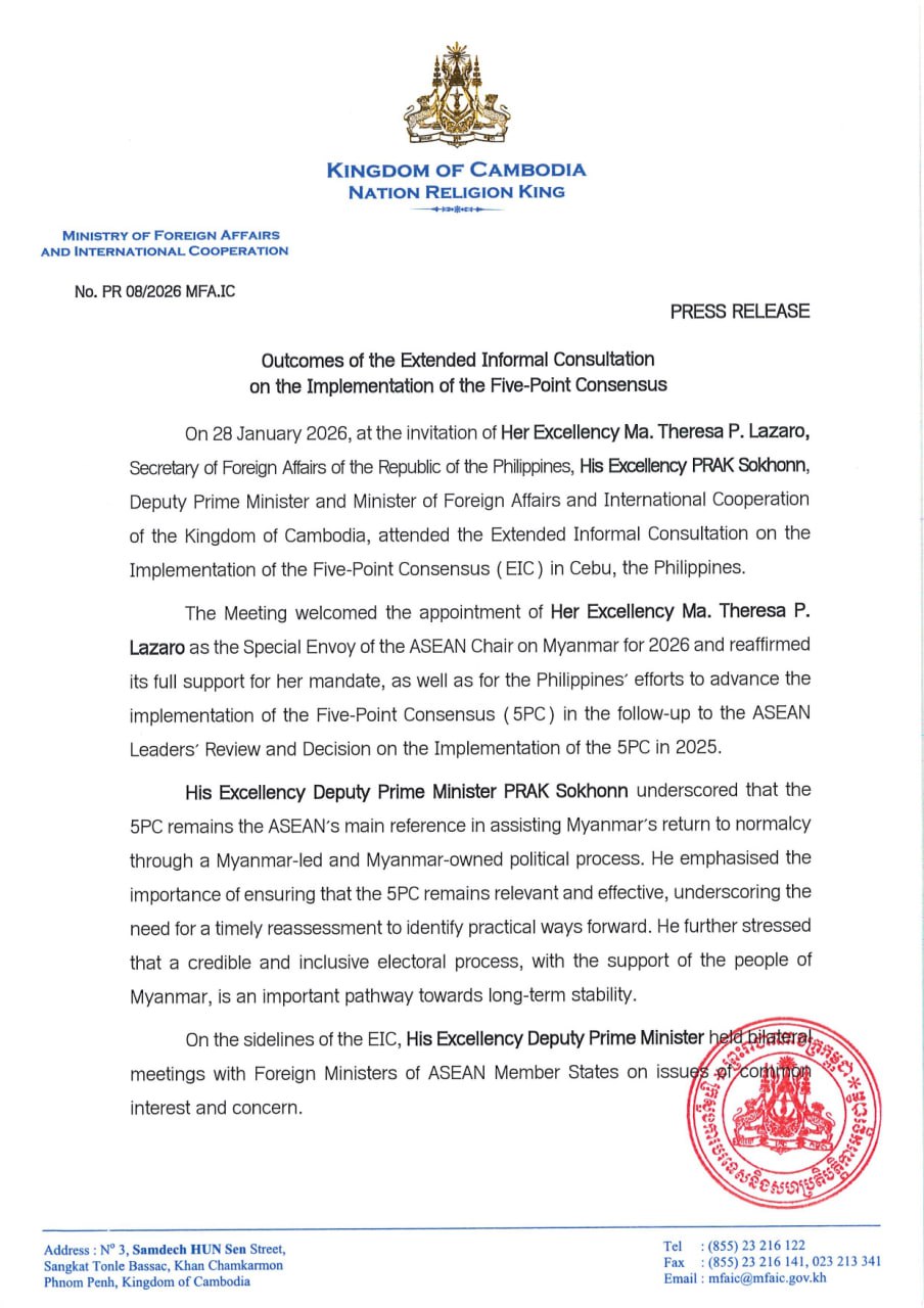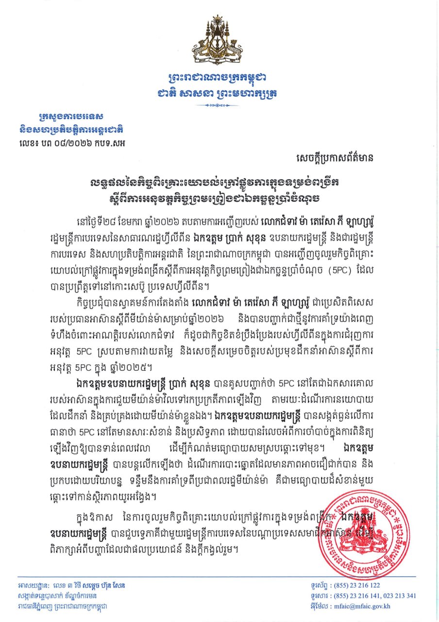 (ភ្នំពេញ)៖ នៅថ្ងៃទី២៨ ខែមករា ឆ្នាំ២០២៦ តបតាមការអញ្ជើញរបស់ លោកស្រី ម៉ាតេរ៉េសា ភីឡាហ្សារ៉ូ រដ្ឋមន្ត្រីការបរទេសនៃសាធារណរដ្ឋហ្វីលីពីន, លោកឧបនាយករដ្ឋមន្ត្រី ប្រាក់ សុខុន រដ្ឋមន្ត្រីការបរទេស និងសហប្រតិបត្តិការអន្តរជាតិ នៃព្រះរាជាណាចក្រកម្ពុជា បានអញ្ជើញចូលរួមកិច្ចពិគ្រោះ យោបល់ក្រៅផ្លូវការក្នុងទម្រង់ពង្រីកស្តីពីការអនុវត្តកិច្ចព្រមព្រៀងជាឯកច្ឆន្ទប្រាំចំណុច បានប្រព្រឹត្តទៅនៅកោះសេប៊ូ ប្រទេសហ្វីលីពីន។